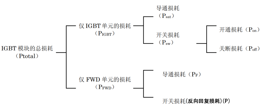 The IGBT module consists of the IGBT unit and the FWD unit, and the sum of the losses generated by each of them is the loss generated by the IGBT module as a whole. In addition, the losses can be generally categorized into conduction losses and switching losses, which are further subdivided as shown below.